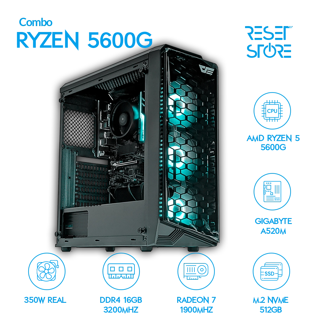 El Combo Ryzen 5 5600G + 16GB + Chasis ARGB viene con la caja darkFlash de panel frontal con diseño de panal. Panel de vidrio templado lateral y frontal. Estructura de alta calidad. Espacio para ventiladores encima de la fuente de poder. Compartimento para discos independientes. Filtro de polvo magnético. Solución térmica. Formato ATX y diseño de espacios excepcional.